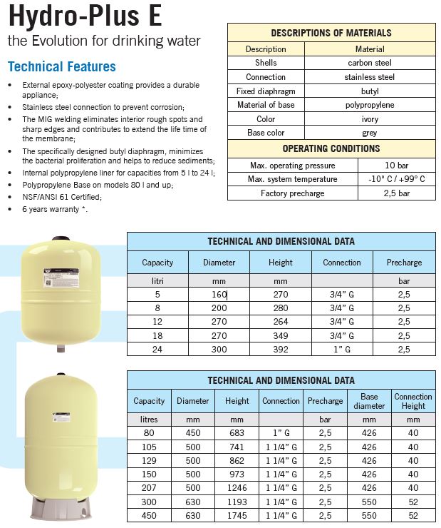 Unutarnja butilna membrana posebno je dizajnirana kako bi spriječila stvaranje sedimenta i rast bakterija, održavajući vodu čistom i sigurnom. Za kapacitete od 5 litara do 24 litre, unutarnja polipropilenska obloga pruža dodatnu zaštitu, poboljšavajući pouzdanost spremnika. Spremnici Hydro-Plus E linije imaju NSF/ANSI 61 certifikat, što osigurava najviše standarde sigurnosti i kvalitete za kontakt s pitkom vodom.
